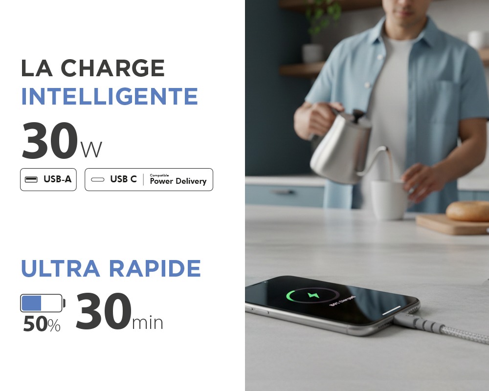 Cette technologie vous permettra notamment de charger jusqu'à 50 % de la batterie de votre iPhone 8 ou modèle ultérieur ou de votre Samsung S20 ou modèle supérieur en 30 minutes environ. Compatible avec les appareils iOS (Apple) et Android (Google, Samsung, Xiaomi, Oppo…), il offre une alternative 3 fois plus rapide, sûre et pratique pour charger tous vos appareils.