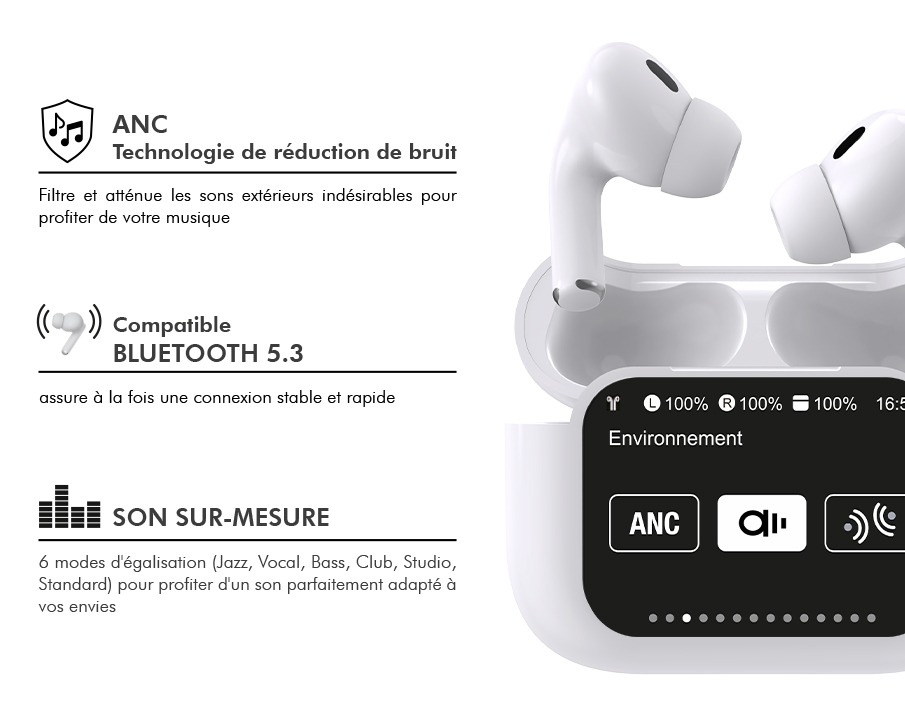 Ecouteurs Play Touch XL True Wireless ANC Ecran tactile 1.65" Intra-auriculaire Blanc + Garantie à vie